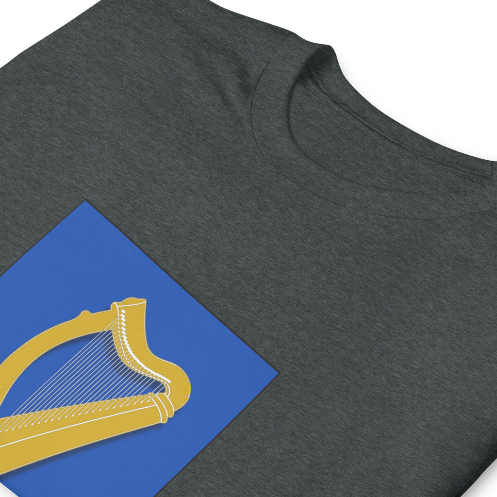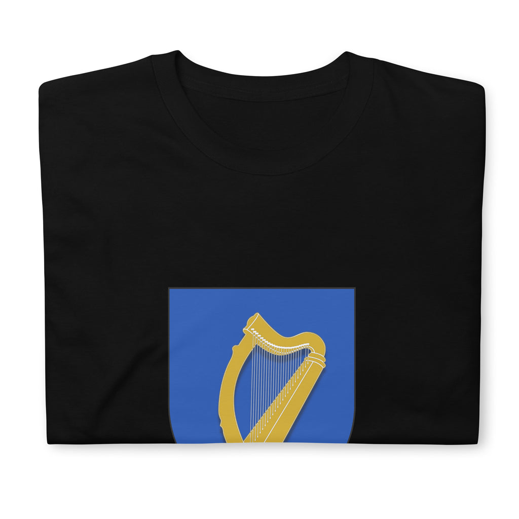 The coat of arms of Ireland - a gold harp on an azure "Patrick Blue" background. Available in black, navy and heather gray in sizes S, M, L, XL, 2X and 3X.